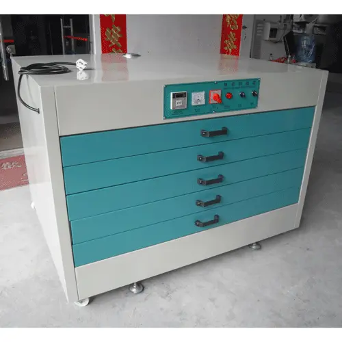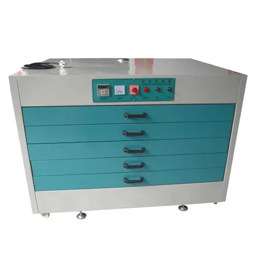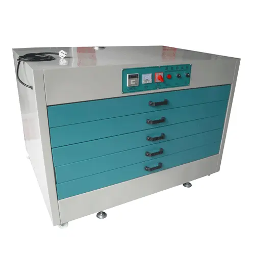 El ventilador de flujo axial instalado en el interior hace que el aire caliente circule, lo que garantiza una temperatura igual en el gabinete y, al mismo tiempo, puede mejorar la eficiencia del secado. El ventilador de flujo axial (especialmente utilizado para equipos informáticos de gran tamaño) normalmente puede utilizarse durante unas 20.000 horas. Por lo general, se necesitan entre 2 y 4 minutos para secar bien las pantallas recubiertas con la emulsión fotosensible.